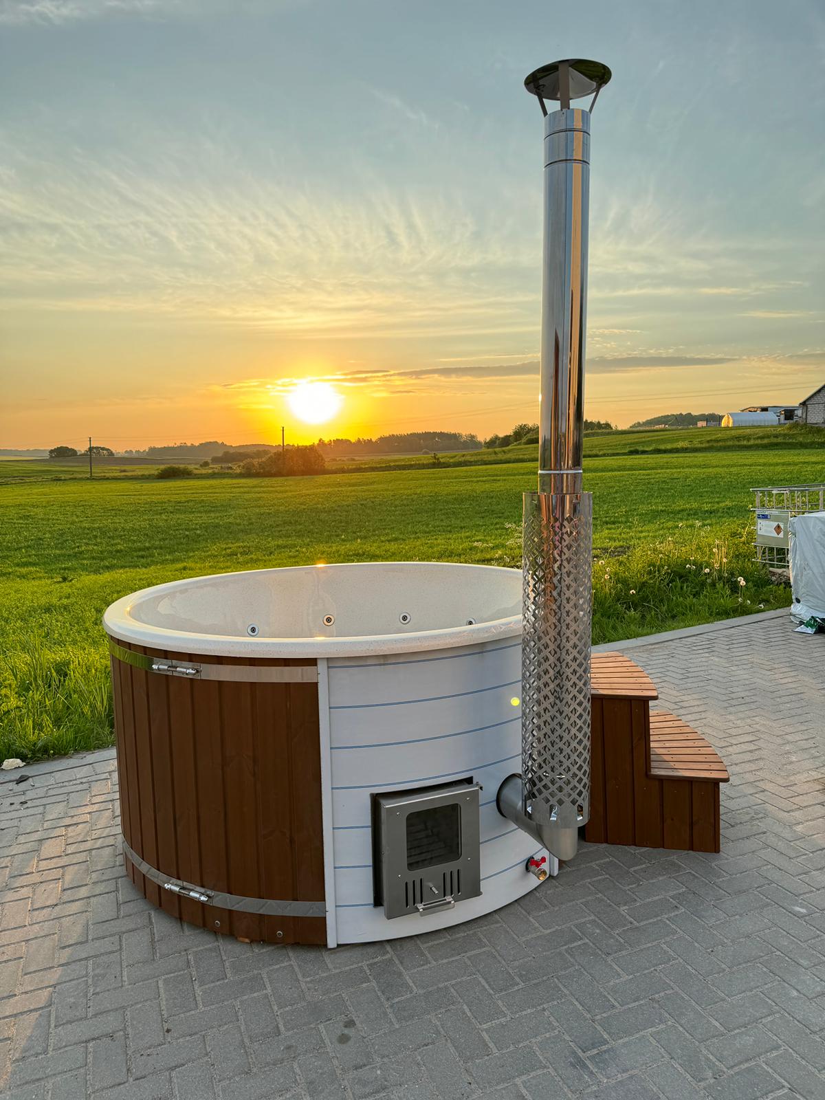 Wer einen Whirlpool für den Garten kaufen möchte, sucht nach der perfekten Kombination aus Optik und Leistung. Bei diesem Modell ist der leistungsstarke Holzofen platzsparend direkt in die Wanne integriert (Innenofen). Das sieht nicht nur besonders authentisch aus, sondern sorgt auch für eine extrem schnelle und effiziente Aufheizzeit des Wassers. Genießen Sie das leise Knistern des echten Holzfeuers, während Sie im 38 Grad warmen Wasser den Alltagsstress hinter sich lassen.