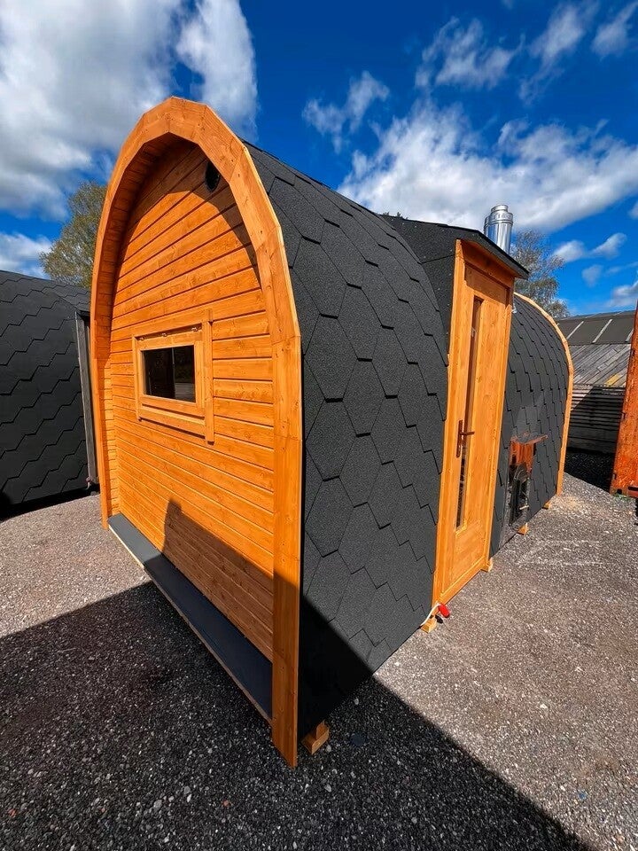 MerkmalBeschreibungDurchmesser2,2 mLänge4 m Holzart Nordische Fichte Innenholz Schwarzerle / Linde Farbe Kastanie Dach Bitumenbeschichtung (Schwarz)Ofen Harvia Elektroofen 9 kWBeleuchtung3 LED-LeuchtenFenster2× 400×400 mm, 1× 500×1000 mm Türen Glastür (Sauna) / Holzaußentür (Eingang)